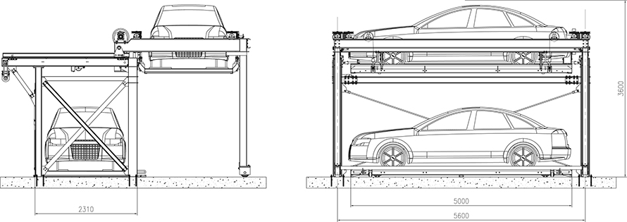 上下兩層車位,上層車位取車,下載車板無車可直接停放在下車臺板上,下載車板有車,則下層車位縱移旋轉至通道,上層載車板下降至地面,車輛便可自由進出;下層停車可直接入庫;